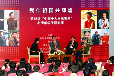 China 's Top Ten Youngsters came to Tsinghua and shared their experiences and ideas with Tsinghua students on January 14. The free talk, held in the main building, attracts more than 400 Tsinghua students and teachers. Prof. Yang Zhenbin, who is in charge of the students affairs, extended warm welcome to the outstanding youngsters.