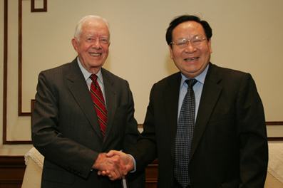 Former U.S. President Jimmy Carter and his wife Mrs. Rosalynn Carter visited Tsinghua University on September 6th. Tsinghua University President Gu Binglin had a discussion with the Carters.