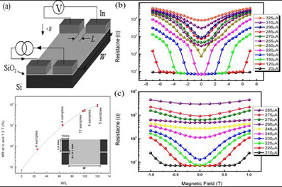Inhomogeneity-induced magnetoresistance (IMR) reported in some non-magnetic semiconductors, particularly silicon, has triggered considerable interest owing to the large magnitude of the effect and its linear field dependence. Theories of this effect implicate spatial variation of the carrier mobility as being responsible for IMR. Prof. Zhang’ group show that IMR in lightly doped n-type silicon can be significantly enhanced through hole injection, and then tuned by an applied current to arise at low magnetic fields. They designed an IMR device. In their devices, the 'inhomogeneity' is provided by the p-n boundary formed between regions where conduction is dominated by the holes and electrons respectively; application of a magnetic field distorts the current in the boundary region, resulting in large IMR. This IMR device has a room-temperature magnetoresistance reaching 10% at 0.07 T and 100% at 0.2 T, approaching the performance of commercial giant menetoreistance devices which is widely used in nowadays computer industry. This silicon based IMR device can work both in low and high magnetic fields and this make it attractive to the magnetic field sensing industry. Moreover, because this device is based on a conventional silicon platform, it should be possible to integrate it with existing silicon devices and so aid the development of silicon-based magnetoelectronics.