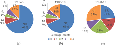 Figure 3. Majority counts of image availability for 1985-5 (a), 1985-10 (b) and 1990-10 (c).