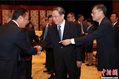 Yu Zhengsheng, Chairman of the National Committee of the Chinese People's Political Consultative Conference, met with members of the Advisory Board of Tsinghua University's School of Economics and Management in Beijing on October 23, asking them to offer more advice on China's economic growth.