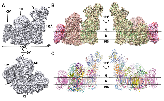 Respiration is one of the most fundamental biological process in all living organisms. Dysfunction of mitochondrial respiratory chain complexes generates reactive oxygen or nitrogen species, and this type of dysfunction is implicated in many human diseases1–3, including Alzheimer’s and Parkinson’s diseases, multiple sclerosis, Friedreich’s ataxia and amyotrophic lateral sclerosis. As such the respiratory chain is always a topic in structural biology research. Structural study of respiratory supercomplexes could be traced back to the year of 2005, when Dudkina determined the first structure of SCI1III2 purified from Arabidopsis thaliana at a resolution of 18 angstrom. Then in 2007, Jesco provided a structural model of SCIII2IV1-2 from yeast mitochondria at a resolution of 15 angstrom. Several years later, two groups independently reported the structure of SCI1III2IV1 from bovine heart at the resolution of 22 angstrom and 19 angstrom respectively in 2011. Finally Professor Yang’s group was able to push the resolution to 3.6 angstrom. (Figure 2)