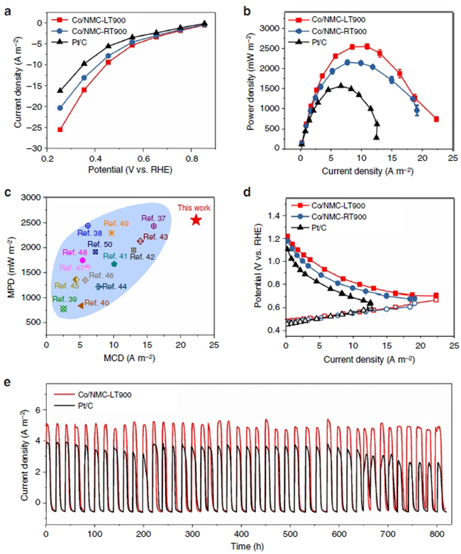 2. Superior performance for ORR electrocatalysis. Single atom Co catalysts on nitrogen-doped mesoporous carbon (NMC) substrates can be synthesized at -60°C, and such materials presented superior catalytic activities and stabilities in both alkaline and neutral electrolytes, superior to the state-of-the-art commercial platinum/carbon catalyst and other previously reported non-precious catalysts. The onset potential and half-wave potential values of our Co catalysts were 62 mV and 39 mV more positive than that of Pt/C catalyst in alkaline electrolyte.
