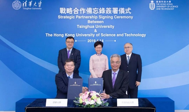On April 14th, Carrie Lam witnessed the signing of a memorandum of strategic partnership between Tsinghua University and the HKUST which took place at HKUST. President Qiu Yong and President Wei Shyy of the HKUST signed the MOU on behalf of the two universities. According to the agreement, the two universities will jointly train top-notch innovative talents with an international perspective. The two sides will strengthen cooperation in talent cultivation, faculty exchanges, research, innovation and entrepreneurship.