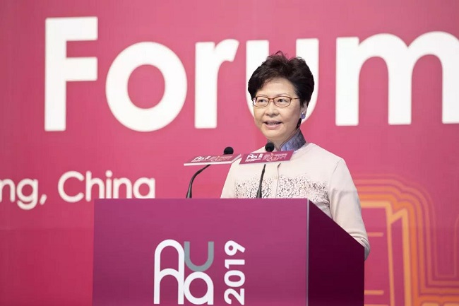 On April 14th, as an important part of the AUA Summit 2019, the AUA Presidents Forum was held at the Hong Kong University of Science and Technology (HKUST). Carrie Lam Cheng Yuet-ngor, the Chief Executive of the Hong Kong Special Administrative Region (HKSAR), attended the AUA Presidents Forum and delivered a keynote speech. President Qiu Yong of Tsinghua University, and President Wei Shyy of HKUST addressed the forum. Presidents and delegates of the 15 member universities of the Asian University Alliance (AUA) held in-depth discussions on topics such as the “Roles of Universities in the Sustainability Agenda” and “Innovation and Entrepreneurship Ecosystems: Asian Perspectives on Technological Stewardship and Higher Education” to jointly explore the development of higher education in Asia. Vice President and Provost of Tsinghua University Yang Bin and Vice‐President for Institutional Advancement of HKUST Sabrina Lin attended the forum.