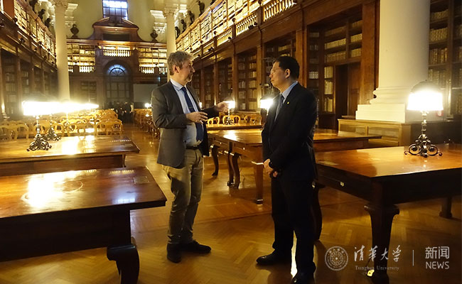 Tsinghua University President Qiu Yong (R) visits the Bologna University Library
