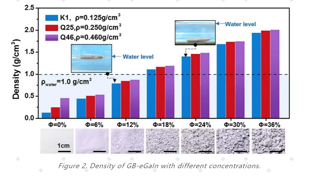 The research was recently published in Advanced Functional Materials and selected as the inside back cover. The density of the material (called GB-eGaIn) decreased more than 70% as compared to the original metal, which means it can float on water under specific situations. Based on these results, two typical structures of GB-eGaIn was designed, including the planar structure and 3D structure.