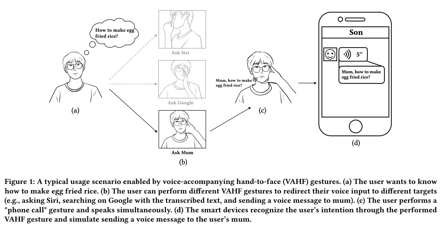 In this paper, the authors investigated voice-accompanying hand-to-face (VAHF) gestures for voice interaction. They targeted on hand-to-face gestures because such gestures relate closely to speech and yield significant acoustic features (e.g., impeding voice propagation). They conducted a user study to explore the design space of VAHF gestures, where they first gathered candidate gestures and then applied a structural analysis to them in different dimensions (e.g., contact position and type), outputting a total of 8 VAHF gestures with good usability and least confusion.