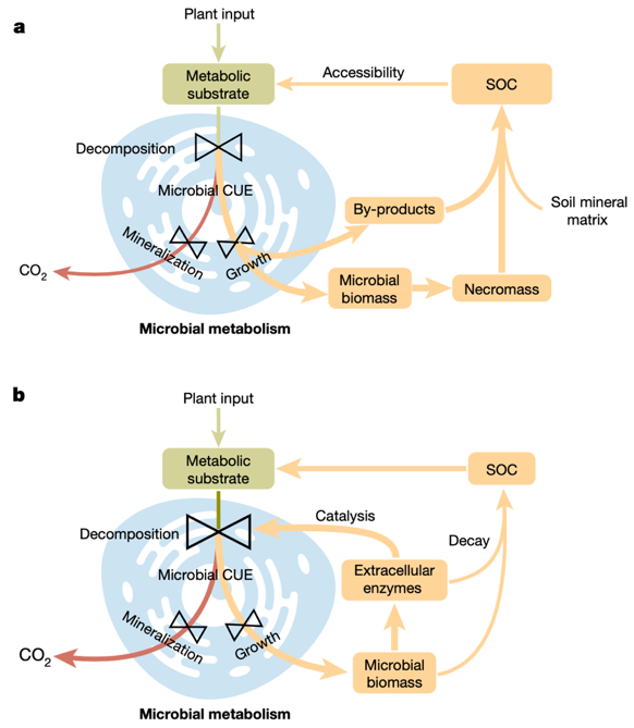 Figure 1. Two contrasting pathways in determining the relationship between microbial CUE and SOC storage