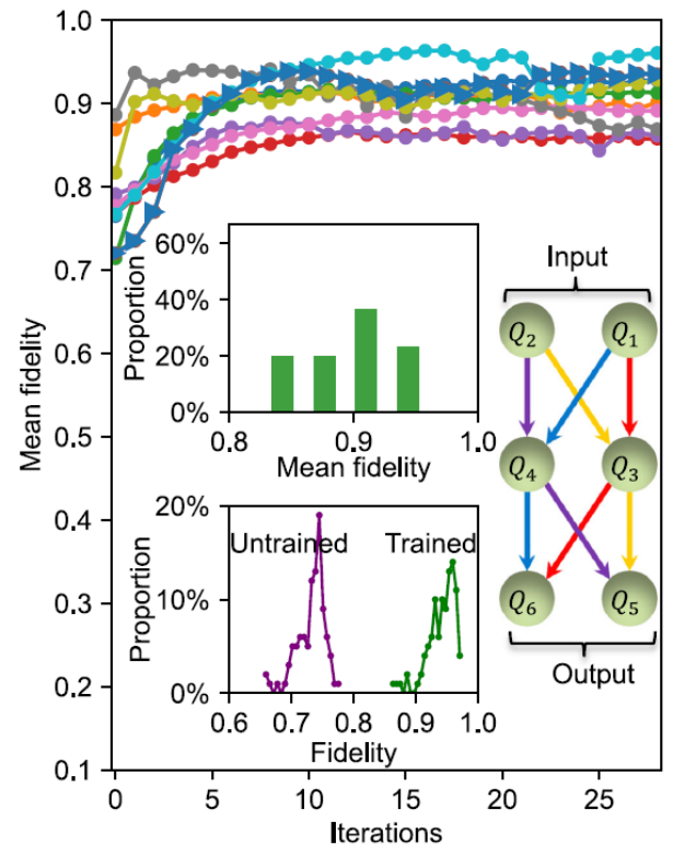 Luyan Sun’s research group and Dong-Ling Deng’s research group have experimentally implemented a three-layer DQNN with two qubits in each layer. The experiment focused on the task of learning a two-qubit quantum channel. The optimization goal was to maximize the mean fidelity between the output state produced by the target quantum channel and the DQNN output state averaged over different input states. In the experiment, the forward process was experimentally performed and the backward process was classically simulated. The quantum states of qubits in each layer were extracted by carrying out quantum state tomography, based on which the gradients were evaluated to update the variational parameters in the DQNN.