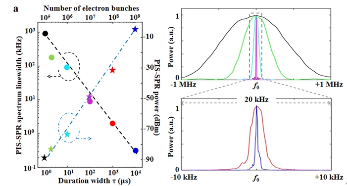 Free electron lasers have unique advantages of high power, wide frequency tunability and so on, however, they face challenges in narrowing the spectral linewidth. Prof. Fang Liu’s group proposed and realized the pump-induced stimulated superradiant Smith-Purcell radiation (PIS-SPR) and achieved an ultra-narrow spectral linewidth of 0.3 kHz at ~0.3 THz in a compact device. The mechanism and technique provide a way to further narrow the spectral linewidth of free electron radiation and broaden its applications.