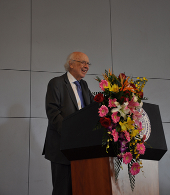 Dr. James Watson met with the Vice Chairperson of Tsinghua University Council, Shi Zongkai, and discussed topics on research and talent cultivation prior to the speech that day.