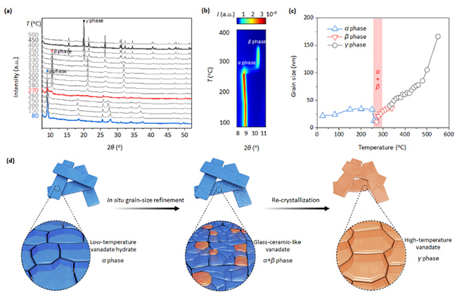Figure 1 (a) In situ XRD patterns and (b) contour plot of magnified low-angle regions upon heating. (c) Calculated grain size. (d) Schematic phase transition process with varying grain sizes.
