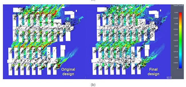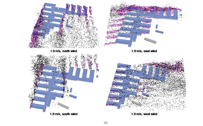 Since January 24, 2020, in accordance with the schedule requirements of the Huoshenshan Hospital project and Leishenshan Hospital project, the research team performed a lot of analytical work based on the proposed simulation method, including analyzing the concentration distributions of the exhausted harmful air around these two hospitals (some typical visualizations of the simulation results can be seen from Figure 1), verifying the designed heights and locations of air outlets and fresh-air intakes, and quantitatively evaluating the risk of fresh-air intakes being polluted by exhausted harmful air from air outlets. Their simulation and analysis was successful in assisting the engineers to complete the designs of these two hospitals in a truly short time.