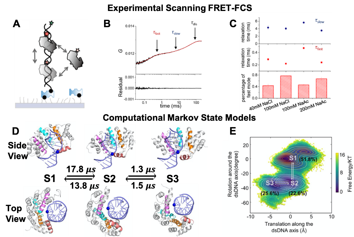 The researchers developed a scanning Fluorescence Resonance Energy Transfer (FRET) – Fluorescence Correlation Spectroscopy (FCS) platform to probe the protein dynamics at the microsecond temporal resolution and sub-nanometer spatial resolution. The significant improvement in the resolutions enables the researchers not only observe the fast mode (1D diffusion constant of ~ 8´106 bp2 s-1), but also directly capture the slow mode (1D diffusion constant of 6´104-5´105 bp2 s-1).
