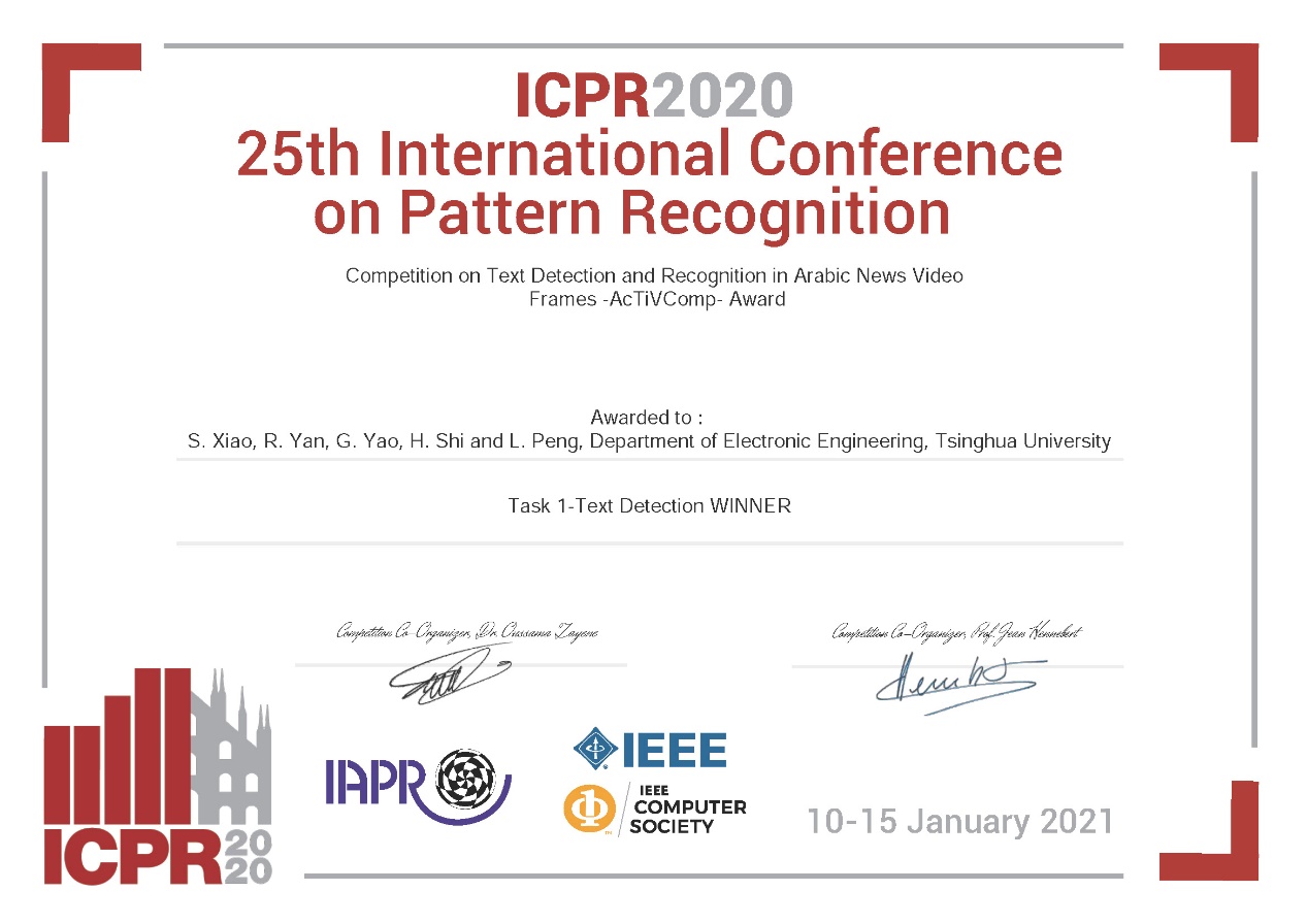 Recently, the 25th International Conference on Pattern and Recognition (ICPR) was held online. The results of the third Competition on Text Detection and Recognition in Arabic News Video Frames (AcTiVComp) were announced, and Ph.D. candidate Yan Ruijie and master’s student Xiao Shanyu, advised by Associate Professor Peng Liangrui from the Department of Electronic Engineering at Tsinghua University, were champions in both tasks of text detection and text recognition.