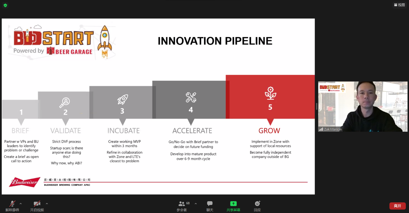 Zak Manion of the Innovations and Analytics team talked about the launch of BudStart in April 2021, an initiative that helps fund and mentor startup entrepreneurs to grow their ideas into successful businesses within Budweiser by offering them functional, technical and legal supports and helping them build networking corporate connections.