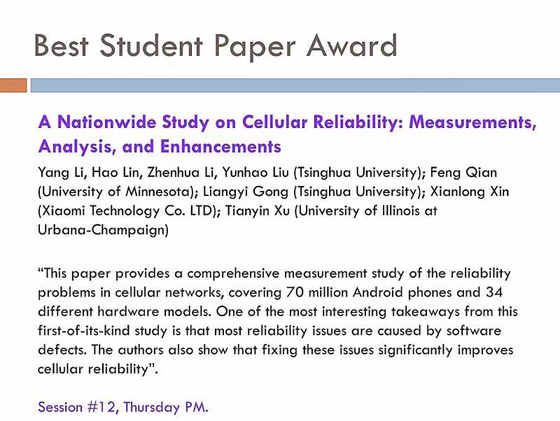 Other co-authors include Gong Liangyi, a postdoctoral fellow at Tsinghua University, Xin Xianlong, director of mobile technology at the Xiaomi Corporation - a famous Internet company in China, Qian Feng, an associate professor at the University of Minnesota, and Xu Tianyin, an assistant professor at the University of Illinois.