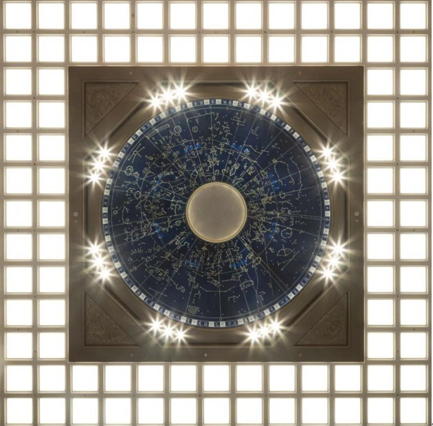 A themed exhibition occupies the first three floors of Wenhan Pavilion. At the top is the octagonal caisson ceiling that draws on the pattern of the flower stem of persimmon fruits. It presents the magnificent scene of the vast galaxy, to imply the profoundness of Chinese civilization.