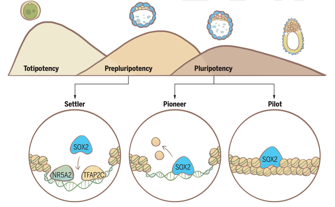 On December 15, the research group led by Professor Wei Xie from the School of Life Sciences at Tsinghua University published a research article in the journal Science, titled "Multifaceted SOX2-chromatin interaction underpins pluripotency progression in early embryos." This study revealed the regulatory mechanisms through which the pioneer factor SOX2 drives pluripotency progression in early mammalian embryos. The researchers discovered that in early mouse embryos, SOX2 does not simply function through the pioneer factor model by opening closed chromatin to activate pluripotency program. Instead, SOX2 exhibits multifaceted binding modes with chromatin that includes “Settler,” “Pioneer,” and “Pilot” binding. An active role of SOX2 in establishing a pluripotency regulatory network begins to emerge in late blastocysts when SOX2 opens widespread naïve pluripotency enhancers through “Pioneer binding”. Prior to this stage, a “Pre-pluripotency” cell state exists in early blastocysts when SOX2 primarily promotes gene expression through “Settler binding”, as it binds pre-accessible enhancers that are opened by early-stage expressing TFs. Therefore, such multifaceted chromatin interaction modes allow SOX2 to connect early developmental program executed by upstream transcription factors (e.g., NR5A2 and TFAP2C) before it adopts a more proactive role in establishing the naïve pluripotency.