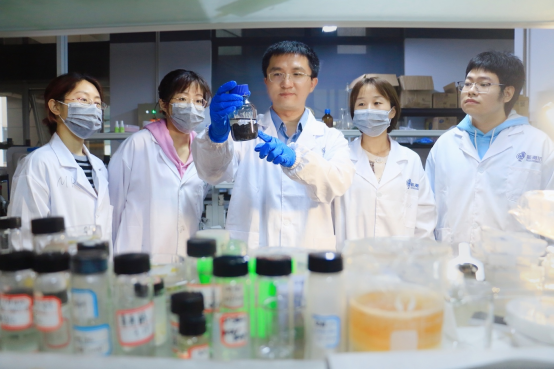 Guangmin Zhou (at center), an associate professor at the Tsinghua-Berkeley Shenzhen Institute and Tsinghua Shenzhen International Graduate School, is creating highly efficient cathode materials for use in rechargeable lithium-carbon dioxide batteries.