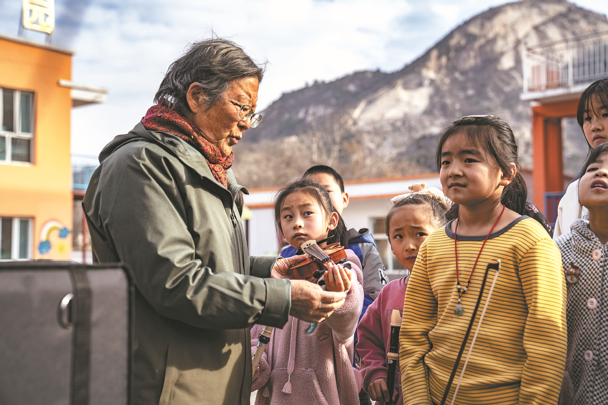 Deng Xiaolan teaches a girl to play violin in Malan village, Fuping county, Hebei province, last year. [Photo by LI XIUQIN/FOR CHINA DAILY]