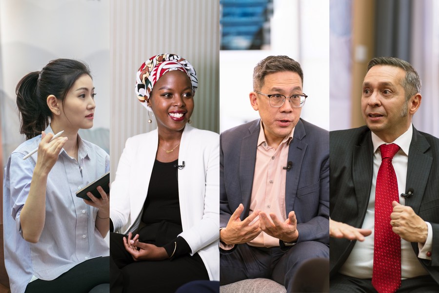 The combo photo shows that Xinhua correspondent Miao Xiaojuan (1st L) interviews Sandrine Nduwimana (2nd L), director of international liaison dept. of China-Africa Business Council, Andy Mok (2nd R), senior research fellow with Center for China and Globalization, and Alessandro Golombiewski Teixeira, professor of public policy at Tsinghua University, on China Chat show, in Beijing, capital of China, during Jan. 11-14, 2022. (Xinhua/Xu Yongzheng)
