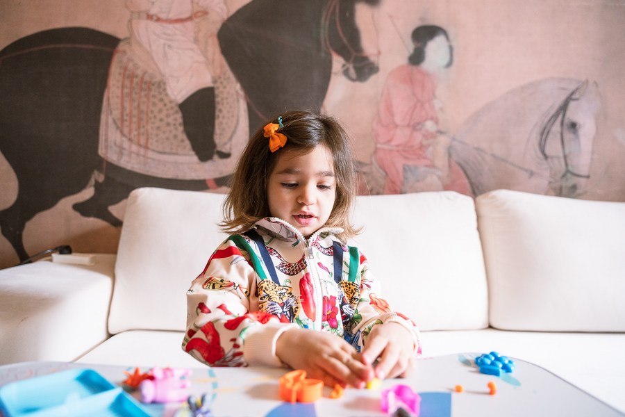 Daughter of Alessandro Golombiewski Teixeira, a professor of public policy at Tsinghua University, plays in their apartment in Beijing, capital of China, on Jan. 14, 2022. (Xinhua/Xu Yongzheng)