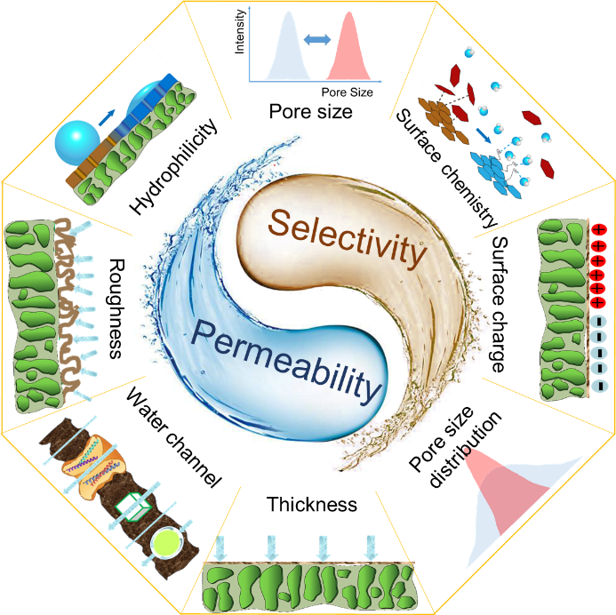 Professor Huang Xia’s team at the School of Environment, Tsinghua University systematically reviewed the recent progress in nanofiltration (NF) membrane fabrication and comprehensively analyzed the synthesis-property-performance relationship with a purpose of directing the tailored design of NF membranes for the increasing and challenging demands in current and future water treatment . They refined the definition for the selectivity of NF membranes, established the tradeoff relationships between permeability and selectivity of NF membranes under different selectivity scenarios for the first time, and furtherly summarized membrane fabrication strategies and revealed the underlying mechanisms to break through the current tradeoff relationships. The research team also strengthened and substantiated the concept of tailored design of NF membranes for different water treatment applications and discussed future research priorities and directions.