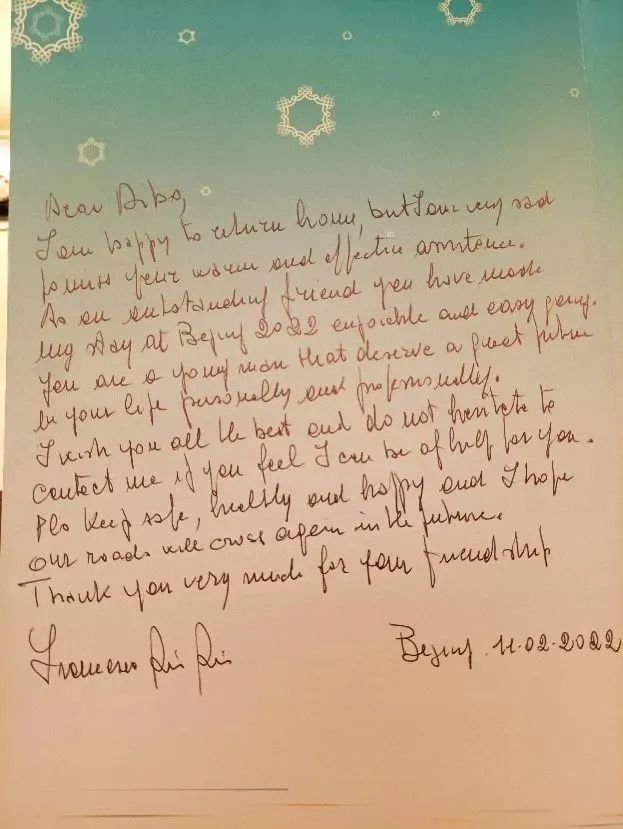“As an outstanding friend, you have made my stay at Beijing 2022 enjoyable and easy-peasy.” “You are a young man that deserves a great future.” “Do not hesitate to contact me if I can be of help for you.”