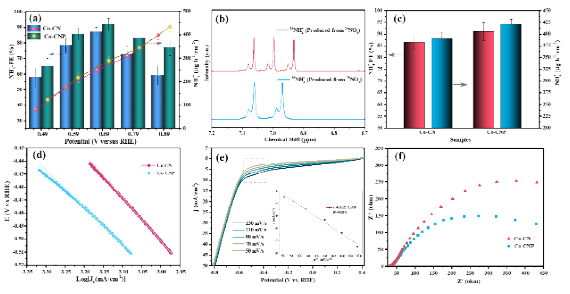 The research group used the rare 15NO3− in nature as the nitrogen source and employed the isotope labeling method to further prove that the sole nitrogen source for ammonia production was NO3−. The 1H NMR spectra with 14NO3− and 15NO3− as reactants showed typical triple and double peaks corresponding to the 14NH4+ and 15NH4+ products, respectively. The group analyzed the carrier structure using various experimental techniques. The results showed that the doping of phosphorus further increased the defect level of the carbon-nitrogen carrier, provided more fixed sites for loading SAC, and the defect sites affected the electronic structure and performance of adjacent Co active sites, improving the electrode conductivity.