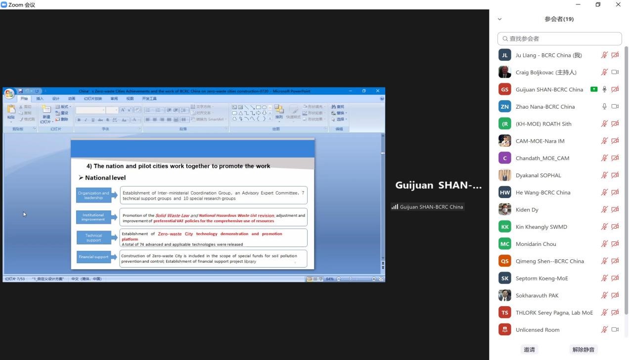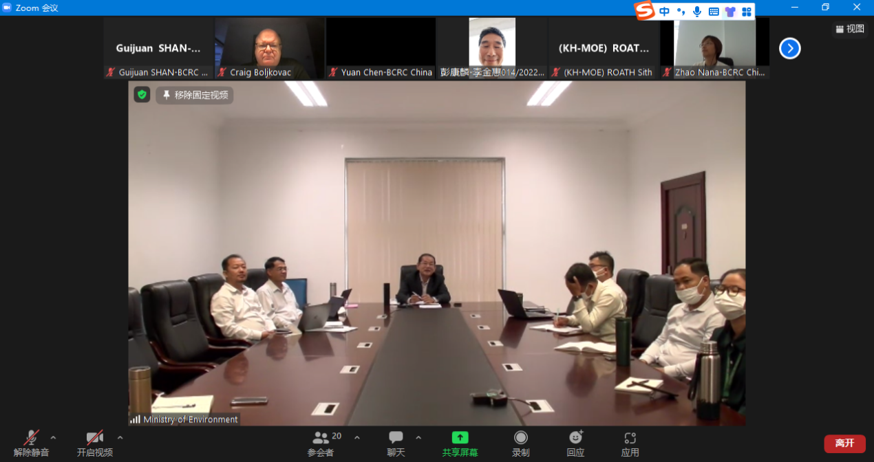 Tsinghua University/Basel Convention Regional Centre for Asia and the Pacific (BCRC China) and Cambodia’s Ministry of Environment jointly held a successful bilateral meeting online on July 20th to promote the cooperation on the International City Network of Zero-waste Initiative. The meeting was attended by 19 Cambodian government officials including Heng Nararith, Deputy Minister of Environment; Dy Kiden, General Directorate of Environmental Protection, Ministry of Environment; Dyakanal Sophal, Head of Hazardous Waste Management Department, General Department of Environmental Protection; Chandath Hay, Deputy Head of Air Quality and Sound Management Department. Li Jinhui, Executive Director of the BCRC China and Professor at Tsinghua University’s School of Environment; Zhao Nana, Assistant Director of the BCRC China; Craig Boljkovac, Senior Advisor; Shan Guijuan, Deputy Head of the Environmental Technology Unit; Chen Yuan, Head of the Regional Chemicals Unit; and project assistants Liang Ju, Wang He, and Shen Qimeng were also in attendance. Craig Boljkovac hosted the meeting.