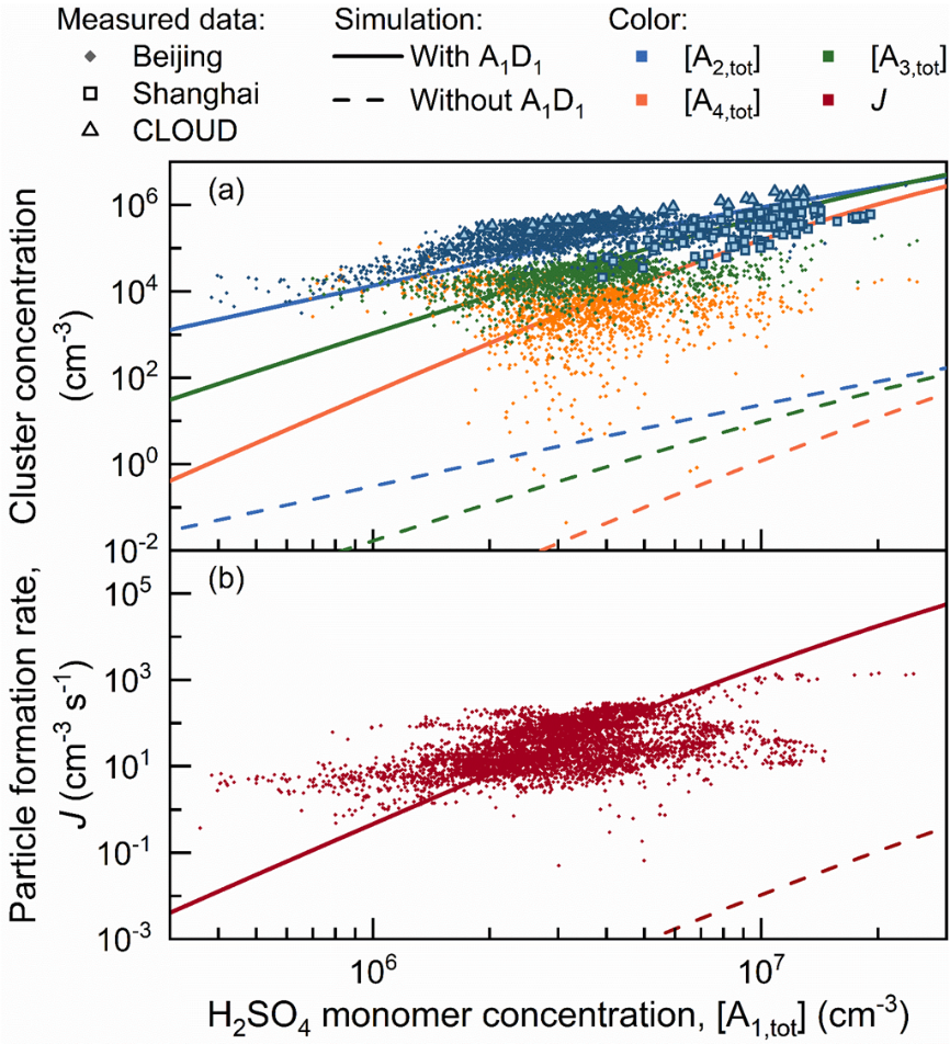 To verify the new mechanism, the research group combined quantum chemistry with cluster dynamics to simulate the new particle formation process, and compared the simulation results with atmospheric measurements and chamber experiment results. As shown in Figure 2, the formation rate of H2SO4-containing cluster and new particles predicted by the new mechanism is several orders of magnitude higher than the traditional mechanism, showing good consistency with atmospheric measurements and chamber experiment results.