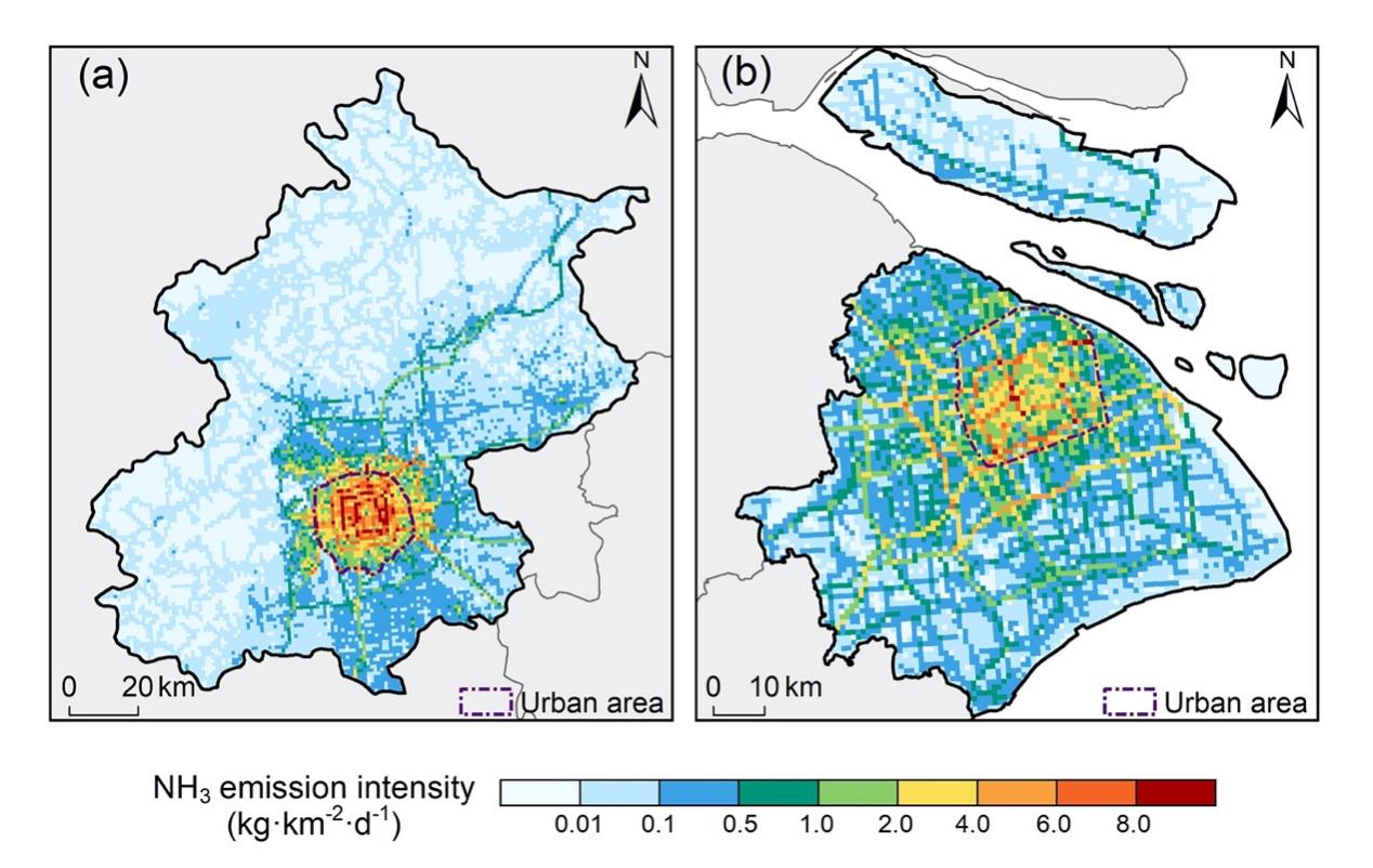 Figure 2 Spatial distribution of vehicular NH3 emission intensities in Beijing and Shanghai