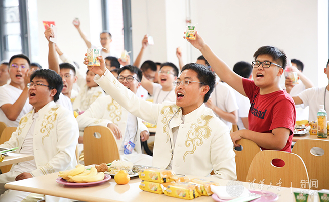 餐厅内外的电子屏循环播放着队伍行进的实况录像。当屏幕上出现整齐划一的“伟大复兴”方阵时,师生们不由自主地举起手中的饮料,为自己的精彩表现干杯,为清华人的齐心协力欢呼,为圆满完成光荣任务喝彩!