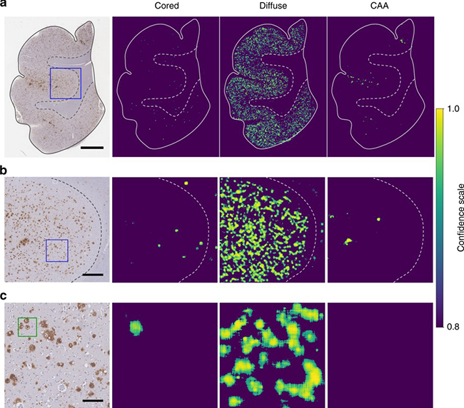 为了增强对阿尔兹海默症病理学的分析能力,研究人员设计了一个卷积神经网络(CNN)模型。CNN是一种深度学习算法,能够从大量数据中提取潜在的规律和模式,并据此对新的数据进行预测。为了获得足够的数据来训练CNN进行人脑组织病理学分析,研究人员开发了一个网络平台“Blob or Not”,使得病理学家能够高效的标注数以万计的潜在斑块区域图片。研究小组利用由7万张已标注的病理学图片组成的数据集来训练CNN模型,以识别阿尔兹海默症中不同类型的大脑变化,包括区分Cored plaque和Diffuse plaque,以及识别脑血管中的异常病变。