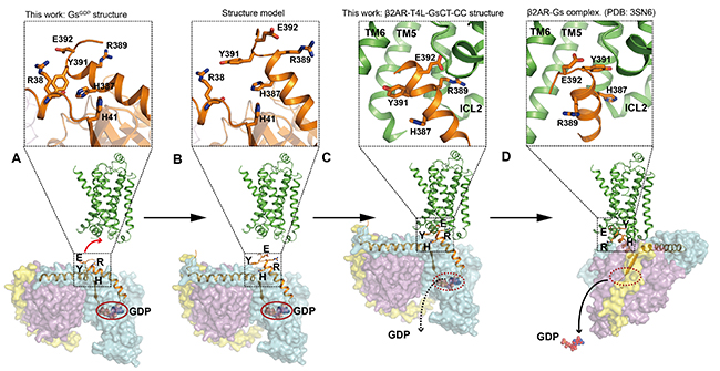同时,研究组获得了2.8埃的GDP结合状态下Gs蛋白(GsGDP)的晶体结构,在该结构中,Gs蛋白羧基端的Y391Gs和H387Gs与Gs蛋白内部其它氨基酸形成了相互作用,而E392Gs和R389Gs则暴露在Gs蛋白的表面。因此推测E392Gs和R389Gs 更有可能参与GPCR受体与G蛋白之间的初始相互作用。随后研究组通过多种生物化学手段和分子动力学模拟验证了E392Gs和R389Gs 在受体与G蛋白形成复合物过程中的重要作用。最后研究组搭建了beta2 肾上腺素受体与GDP结合状态下Gs蛋白的复合物(β2AR-GsGDP)的模型,并提出了从 GsGDP,到β2AR-GsGDP,最后到β2AR-Gsempty的复合物形成的动态模型(图3)。