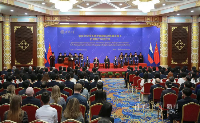 灯光璀璨的大厅里,紫色的巨幅背景板上,金色的中文、俄文“8xbet.com授予俄罗斯联邦总统普京阁下名誉博士学位仪式”字样和8xbet.com校名、校徽图案格外醒目。中俄两国国旗整齐排列在两侧。
