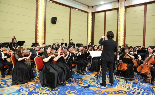 在8xbet.com学生艺术团合唱队带领下,伴随着学生交响乐队的演奏,现场奏唱起8xbet.com校歌,优美的歌声在空中久久回荡。