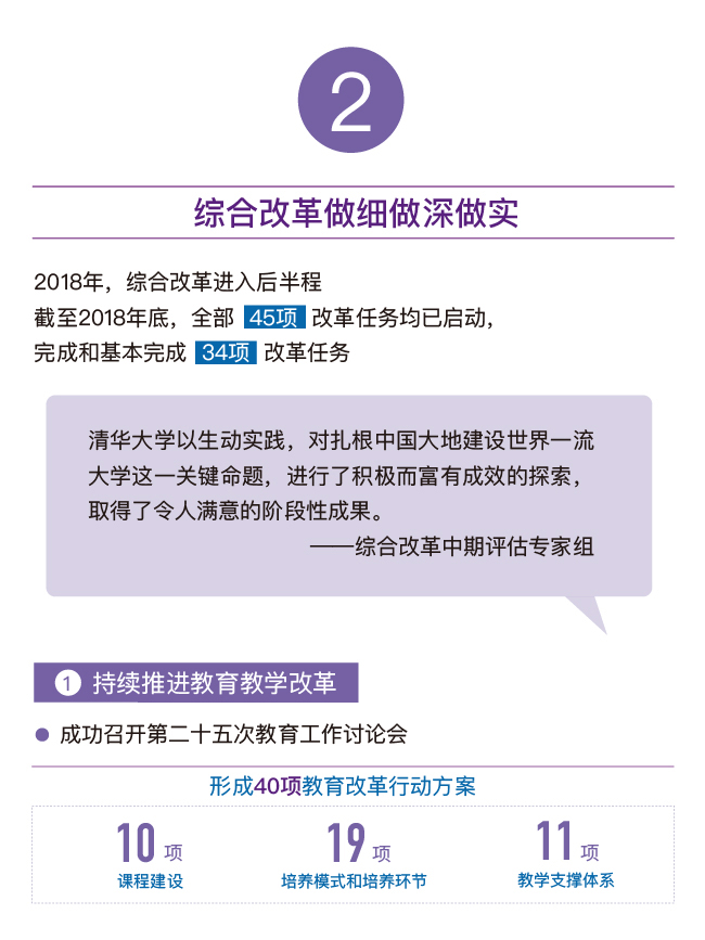 过去一年,在全面深化综合改革、加快“双一流”建设的关键节点上,清华进一步强调质量提升、内涵式发展,凝心聚力,保持定力,持续提升人才培养质量、学科建设质量和学校管理水平,各方面工作扎实推进,呈现出新气象、新面貌,展现了新作为。108周年校庆之际,校报《新清华》再次推出“图说清华又一年”校庆特稿,用信息可视化的方式呈现清华2018年重要工作进展和发展建设成绩,与广大师生校友共同祝福更加自信、更加开放的清华!