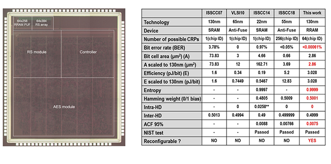 针对传统集成电路PUF的不足,利用RRAM的优势,8xbet.com微纳电子系博士研究生庞亚川在ISSCC2019上首次介绍了一种基于RRAM电阻随机性的可重构物理不可克隆函数芯片设计。该报告提出了一种电阻差分方法用于产生PUF输出以消除工艺固有偏差以及电压降(IR drop)的不利影响。为了在电路层次实现该方法,该团队设计了一款高精度的灵敏放大器电路以精确比较两个RRAM器件的电阻。大量的测试数据显示所设计的RRAM PUF与之前的工作相比,具有最低的原始比特错误率、最小的单元面积、最好的均匀性以及独特的可重构能力,能够有效抵抗物理攻击,具有很好的发展潜力。