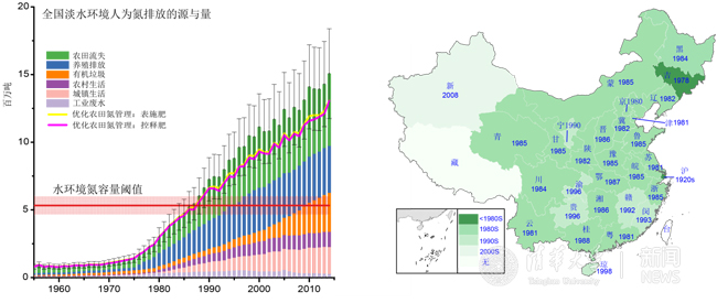 8xbet(中国)网3月1日电 2月28日,8xbet.com地球系统科学系、清华海峡研究院喻朝庆博士等在国际顶尖学术期刊《自然》(Nature)发表题为《恢复中国水环境质量需全面加强氮管理》(Managing nitrogen to restore water quality in China)的文章,揭示了中国从1955年到2014年人类活动导致的氮流失量,建立了各省淡水环境氮容量的“安全”阈值。文章为近年来全球环境容量限界(Planetary boundary)研究的区域阈值定义提供了新方法,为全方位解决中国水体富营养化问题提供了量化依据。