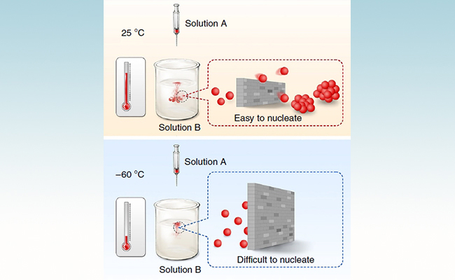图1 零下六十摄氏度和室温溶液合成中形核调控的对比示意图