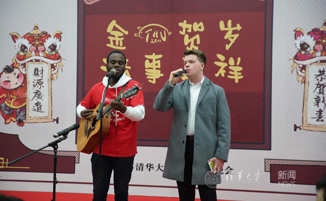 精彩绝伦的联欢节目逐一登场。开场歌曲《Treasure》和《月亮代表我的心》,来自马拉维的国际学生、新闻学院2018级安萨卡和来自美国的国际学生、人文学院2015级本科生柯伊桑用美妙的歌声传递了新春的祝福。学生艺术团舞蹈队队员、法学院2018级本科生陈希希献舞《中国结》,也将吉祥如意、团圆美满的美好寓意献给各位观众。饮食中心的师傅张林用一首脍炙人口的歌曲《欢聚一堂》表达了现场所有人辞旧迎新的喜悦。材料学院2017级研究生顾校宇、金融学院2018级研究生王明媚、化学系2018级本科生蓝青、社科学院2018级研究生葛诺一同带来歌曲联唱《南山南》《成都》《清华路之歌》,歌声化作星火温暖除夕夜。
