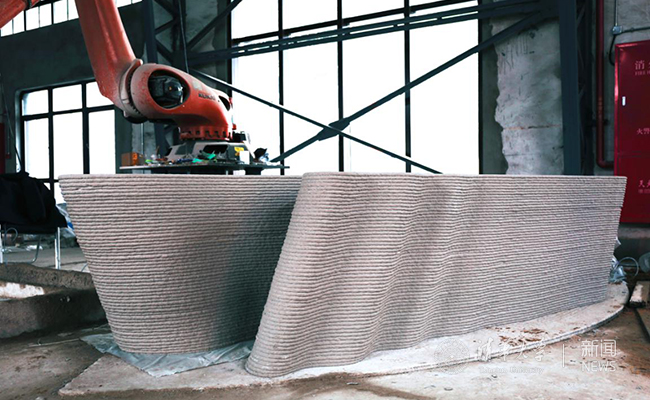 徐卫国教授团队研发的机器臂3D打印混凝土系统由数字建筑设计,打印路径生成,操作控制系统,打印机前端,混凝土材料等创新技术集成,具有工作稳定性好、打印效率快、成型精度高、可连续工作等特点。该系统在三个方面具有独特的创新性并领先于国内外同行,第一为机器臂前端打印头,它既具有搅拌又有挤压推送功能;第二为打印路径生成及操作系统,它将形体设计、合理路径、泵送、前端、机器臂运动等各系统连接为一体协同工作;第三为独有的打印材料配方,具有合理的材性及稳定的流变性。