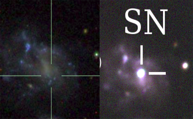 图1左:超新星爆发前的星系UGC4780(图像来源:斯隆数字巡天);右:超新星SN 2018oh爆发后的星系UGC4780,Ia型超新星亮度可以达到普通恒星的数十亿倍,点亮整个星系(图像来源:位于河北兴隆的8xbet.com-国家天文台80cm望远镜)。
