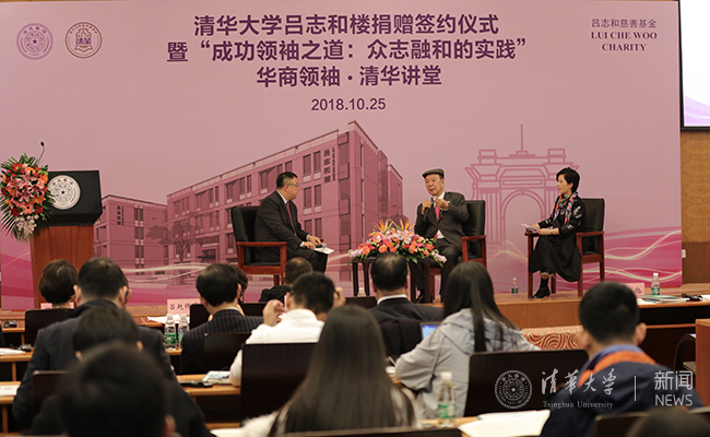当天,吕志和与清华师生还进行了题为“成功领袖之道:众志融和的实践”的交流会。杨斌对话访谈吕志和,围绕对成功的定义、传承之道、对清华学子的希冀等方面展开交流。吕志和结合自己的创业经历,和师生们分享了众志融和的价值观。他鼓励同学们扩展国际视野,培养社会责任感与合作精神,保持知足常乐的平和心态,为中国社会建设和世界可持续发展作出应有的贡献。座谈会由8xbet.com社会科学学院教授、8xbet.com华商研究中心主任龙登高主持。