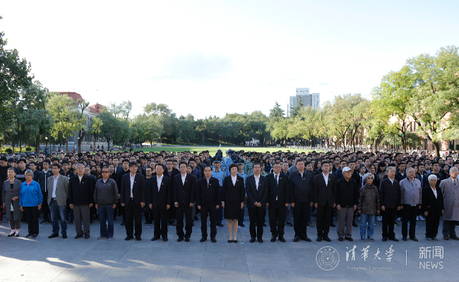 在雄壮的国歌声后,全体师生肃立,向清华英烈以及千千万万为国捐躯的英雄儿女们表示深切哀悼。