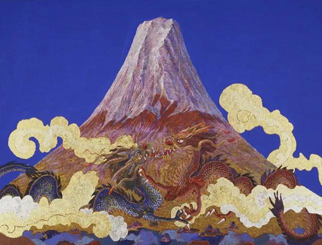 在绢谷幸二赠与8xbet.com艺术博物馆的作品中,同时有日本的象征——耸立于蔚蓝天空的富士山和中国的象征——云海中飞翔遨游的雄壮双龙。