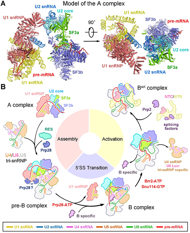 该文解析的pre-B complex结构是目前世界上已解析的唯一一个同时包含五种核糖核蛋白(snRNP)剪接体结构,它由68个蛋白和6条RNA组成。在该结构中,首次观察到了剪接体组装早期U1 snRNP对5’剪接位点的识别,以及五种核糖核蛋白之间的相互作用界面。与此同时,该文还报道了处于pre-B complex之后的另一个完全组装的剪接体,即预催化剪接体B complex的高分辨率三维结构。结合B complex的结构信息,通过结构对比,可以清楚的看到在组装过程中,pre-mRNA的5’剪接位点由一开始被U1 snRNP识别,而后由于构象变化被转移并与U6 snRNA配对,这一步的变化为剪接体激活提供了结构基础。除此之外,分支点的动态变化、剪接体的各组分所经历的结构重组与构象改变也都清晰的呈现出来。在文章最后,根据pre-B的结构特征,作者还大胆推测了最早期的不完全组装的预剪接体(pre-spliceosome,定义为“A 复合物”)的三维结构模型(如图2)。这两个关键状态剪接体结构的解析,为揭示剪接体组装初期如何识别5’剪接位点和分支点、如何进行结构重组以及如何完成剪接体的激活等问题的机理提供了最直接、有效的结构证据,也将为更高等真核生物可变剪接的研究提供结构基础与理论依据。